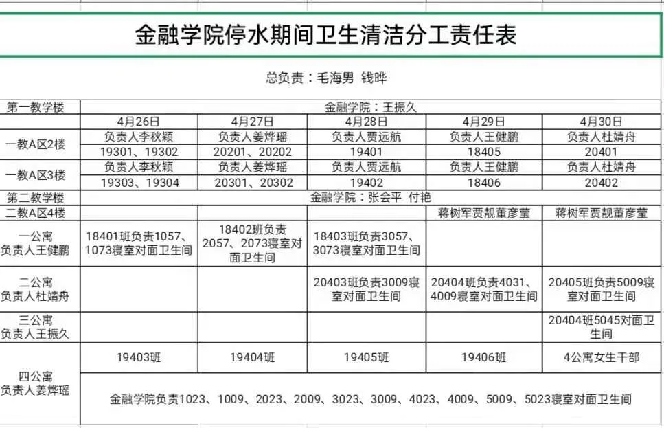 为实现我院学生的日常用水需求和负责区域的日常消毒,在接到学校通知后,金融学院第一时间召开会议安排部署停水期间工作,号召金融学院全体党员,老师,学生干部发挥先锋带头作用,成立由金融学院辅导员老师、学生党员、预备党员、入党积极分子和主要学生干部组成的金融学院应急志愿者群。党委书记毛海男,院长钱晔亲自挂帅,亲临一线,副书记王振久,副院长张会平、付艳,学办主任王健鹏带领辅导员靠前指挥,督战工作,深入教学楼、宿舍楼现场积极协调,狠抓工作落实,形成主要领导亲自抓、辅导老师牵头抓、学生党员干部具体抓、全体学生积极配合的工作格局。