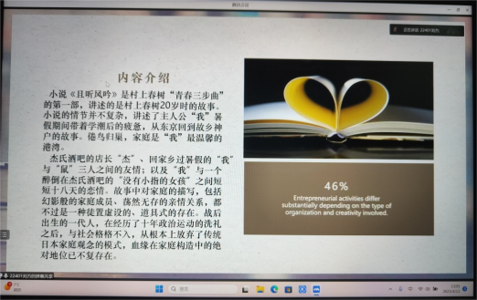 鲁巴金曾说:“读书是在别人思想的帮助下,建立起自己的思想。”在此次读书会中同学们分享自己喜欢的书籍,例如《平凡的世界》、《三体》、《且听风吟》等。同学们详细地介绍作者以及写作背景,故事简介,也会分享他们的读书体会和对书中人物的看法,有的同学也分享了她在《三体》中很喜欢的一句话“我们都是阴沟里的虫子但总还是有人仰望星空给岁月以文明而不是给文明以岁月”。现场的气氛非常良好,同学们积极交流,也提出对于书的不同的理解与分析,推动读书分享会掀起热潮。