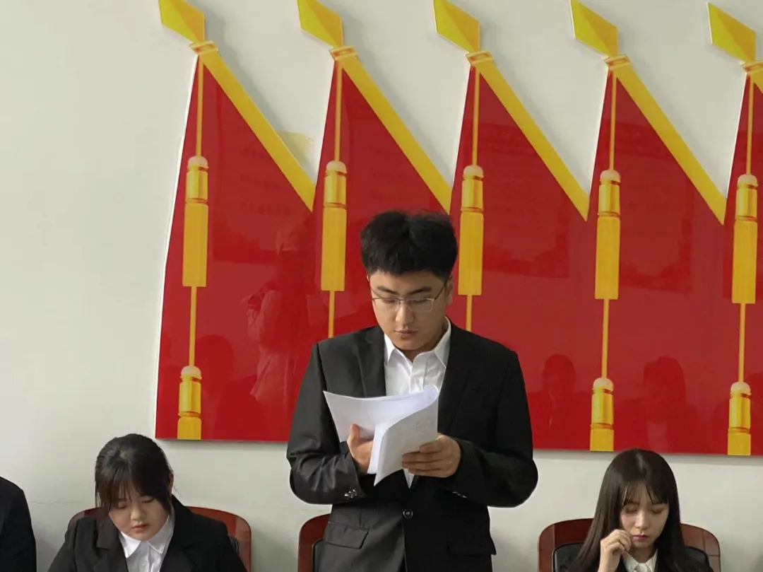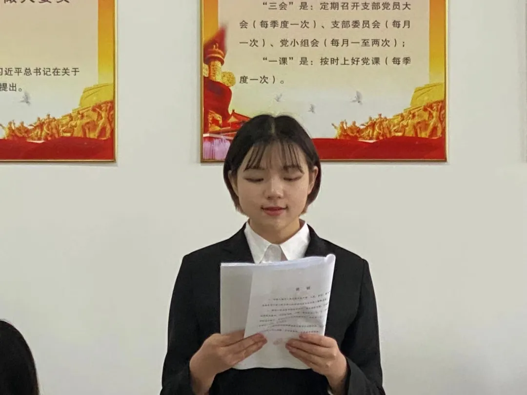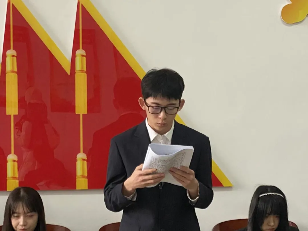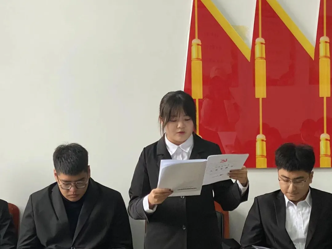 中共吉林工商学院金融学院学生支部委员会严格按照组织发展程序,申请人宣读申请、入党介绍人进行情况介绍、支部全体成员表决后,由宣传委员杜婧舟老师宣读支部大会决议。