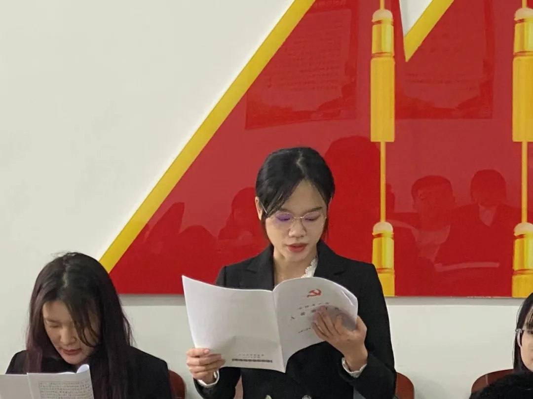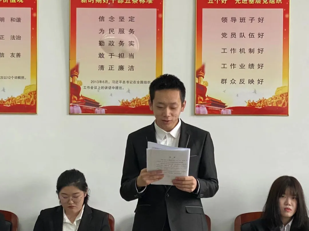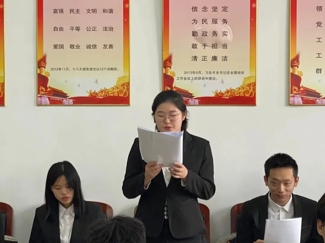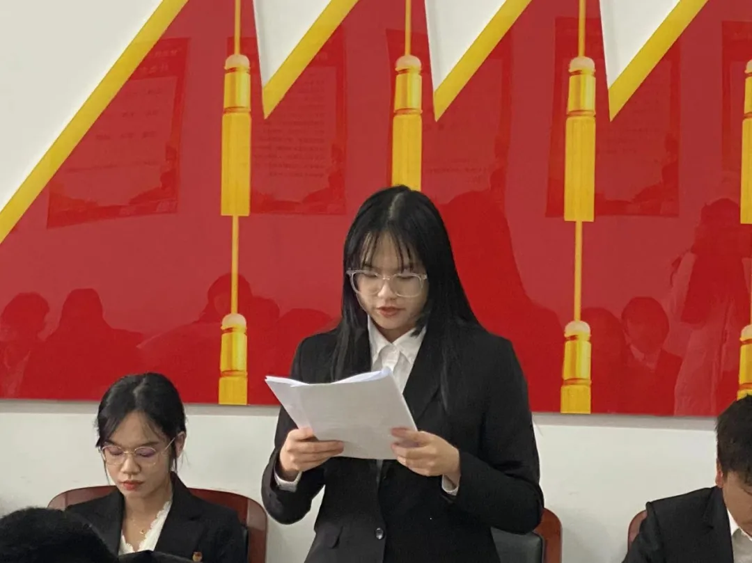 中共吉林工商学院金融学院学生支部委员会严格按照组织发展程序,申请人宣读申请、入党介绍人进行情况介绍、支部全体成员表决后,由宣传委员杜婧舟老师宣读支部大会决议。