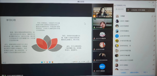 为进一步加强学风建设,帮助22级新生树立学习目标,找到良好的学习方法,提升学习效率,提高学习积极性,金融学院于2022年10月23日于腾讯会议开展“学习经验交流会”主题活动。本次交流会由国家奖学金获得者唐蓉同学主讲,22级新生参加。
