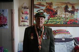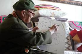 慰问组一行人在金健老战士的家中,听他讲述自己的革命奋斗历程,在几十年的革命历程中,金健荣获过一、二、三等功。别在他胸口的勋章闪闪发亮,英雄的神情展现无遗。除了这些别在衣服上的勋章,金健还给同学们分享了自己身上的伤,右臂被子弹穿透,额头上的枪伤……这些在抗战经历中受过的伤,更是他无形的勋章。