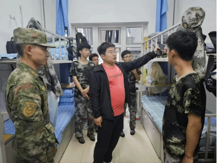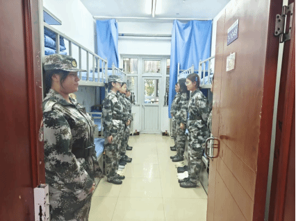 为检验内务整理成效,学团办副主任李秋颖,辅导员周东石及全体军训教官走访学生寝室,对寝室的内务进行指导和检查。