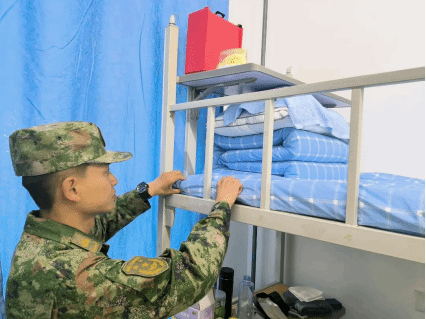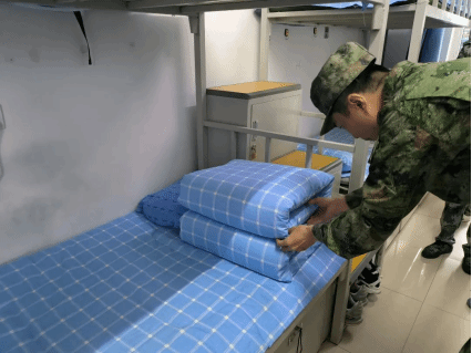 内务整理不仅是日常生活的一个环节,更是个人生活态度与习惯的直接反映。军训教官特别强调了叠被技巧,详细演示了“折叠、压实、理顺”等每一步骤,使得被子叠成了整齐标准的“豆腐块”。