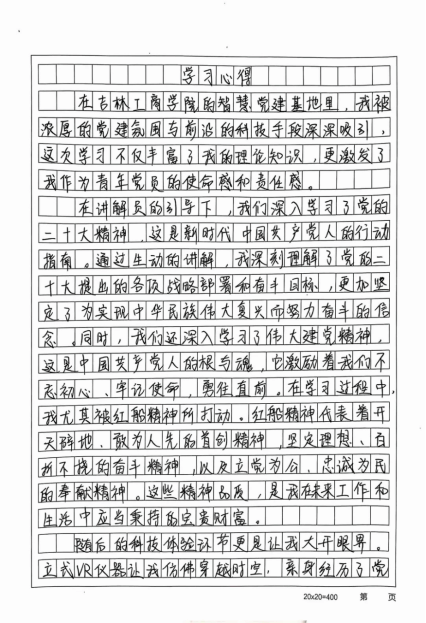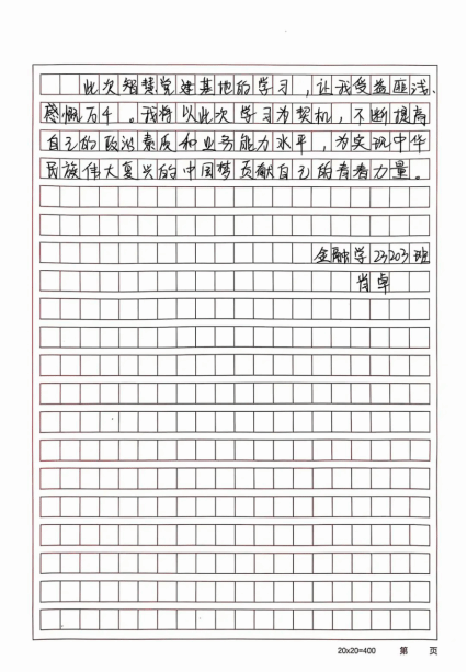 近日,金融学院全体党员在智慧党建基地开展了一次综合性的学习活动,大家将学习的心得体会跃然纸上。