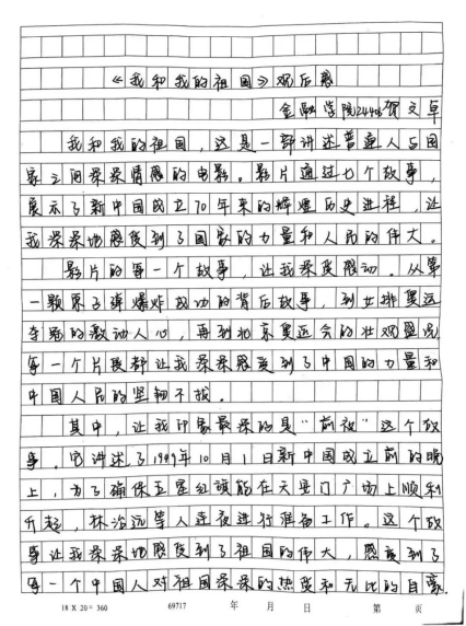 《我和我的祖国》绝非仅仅是一部出色的爱国题材影片,它更是一曲震撼人心的时代颂歌。这部影片使金融学院的学子们对“我和我的祖国”之间的紧密关联以及深厚情愫有了更为深刻的领会。未来,金融学院的莘莘学子们定会持续怀揣着对祖国的挚爱与敬仰,勤奋学习、积极进取、勇于创新、敢于担当,为实现中华民族伟大复兴的中国梦奉献自己的青春活力。