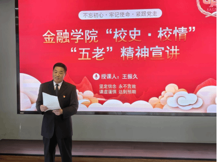 为切实贯彻“五老”共育的教育理念,加强关工委老同志与学院学生之间的沟通交流,传承关工委老同志执着坚定的理想信念,学习“五老”的先进典型事迹,助力学生成长与成才,11月20日,金融学院在博学楼A区433多功能厅隆重举办“校史•校情”“五老”精神宣讲活动。此次宣讲会特邀金融学院专职组织员王振久担任主讲嘉宾。青马筑梦学员代表以及 24 级新生代表共同参与了本次活动。