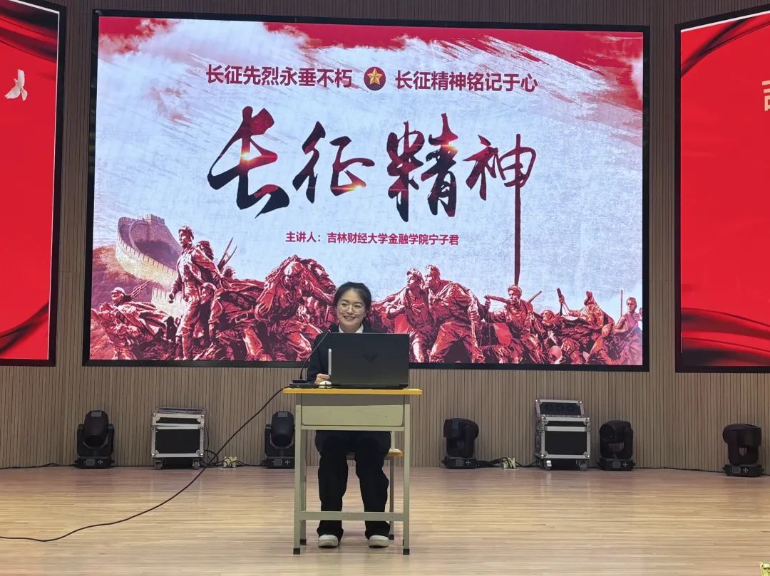 随后,吉林财经大学金融学院学生宁子君作《长征精神》主题讲座。她结合红军长征的艰辛历程,深刻剖析了长征精神的内涵要义,让三校金融学子沉浸其中、深受感动。同时,她结合金融专业特点,深刻阐述了理想信念和顽强意志对职业发展的重要意义,她的讲授引发了在场金融学子的共鸣。