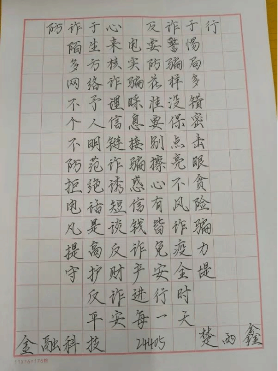为切实筑牢校园反诈“防火墙”,提升广大师生识诈、防诈、反诈能力,6月6日至6月10日,金融学院开展了“防诈于心,反诈于行”主题书法绘画活动。