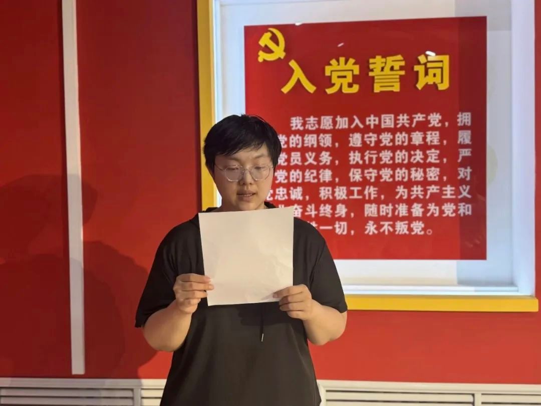 杜婧舟宣读了新发展党员名单,十二名新发展对象跟随李秋颖共同举起右拳,用嘹亮的声音诉说着对党的坚定信念和为共产主义事业奋斗终身的坚决态度。
