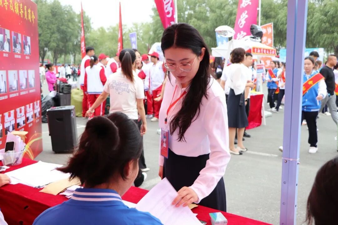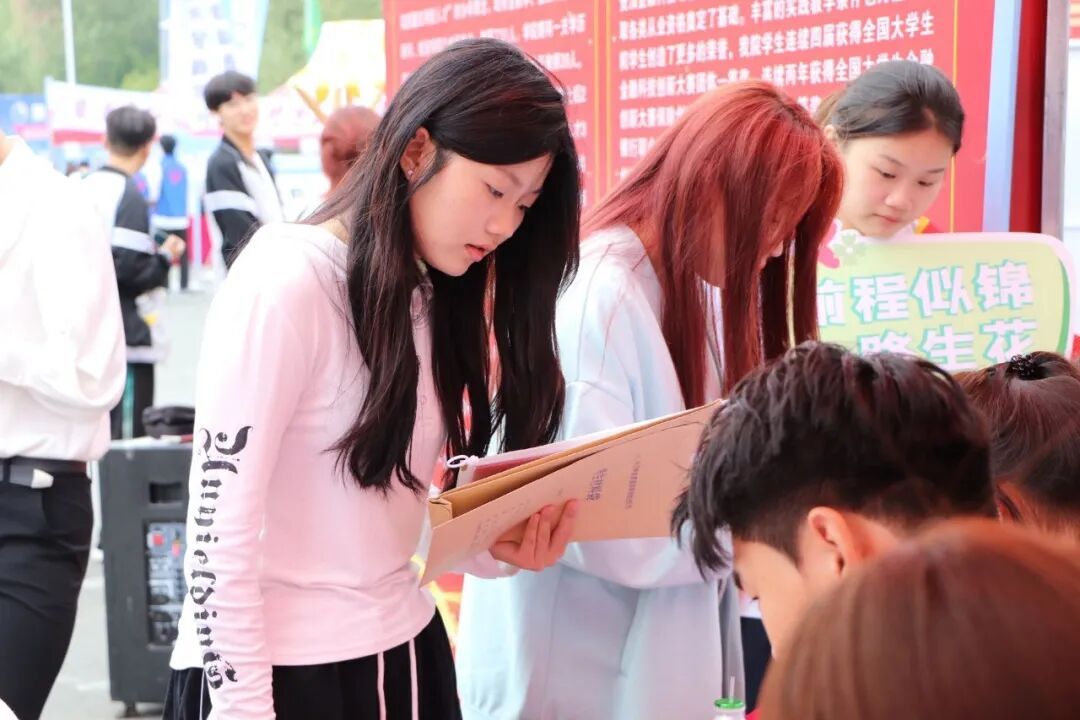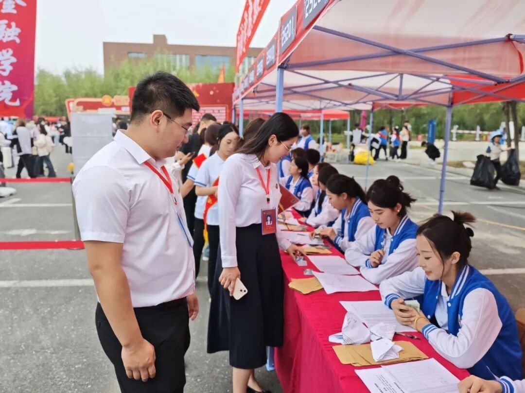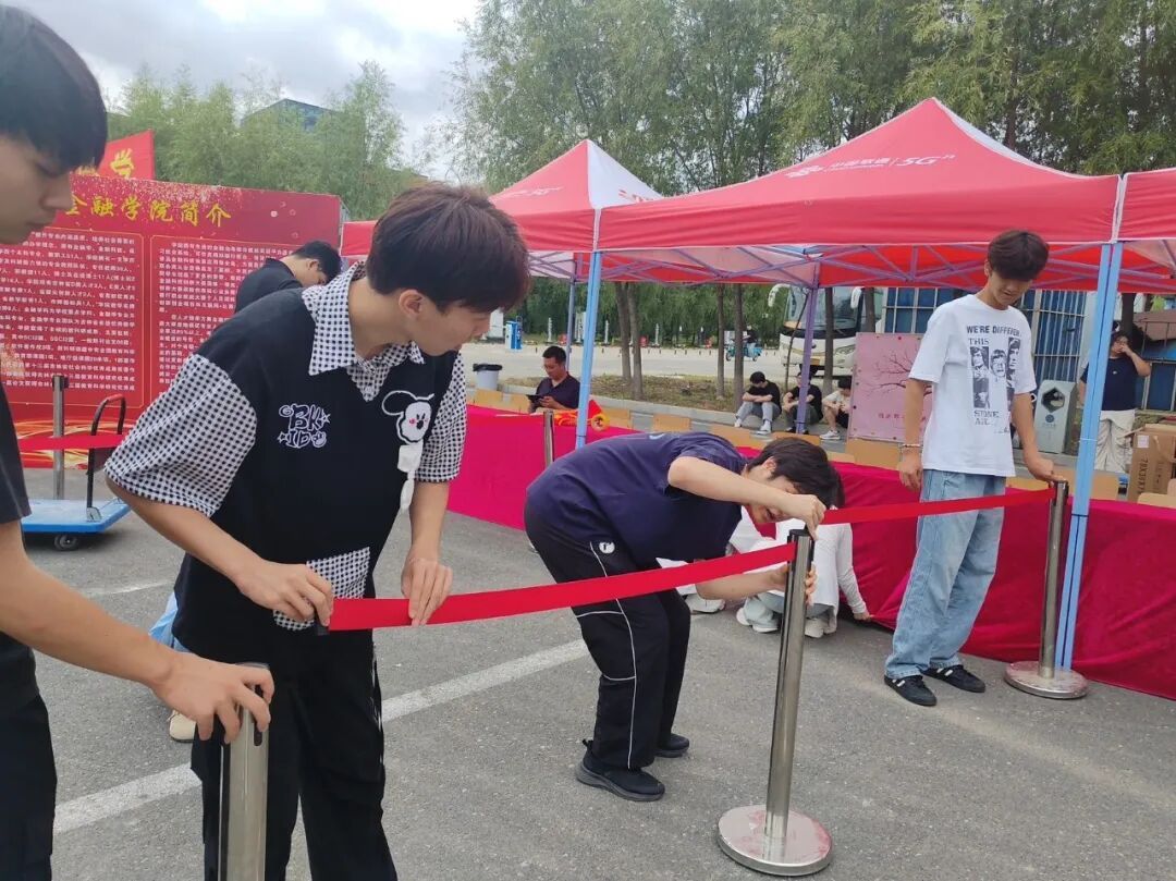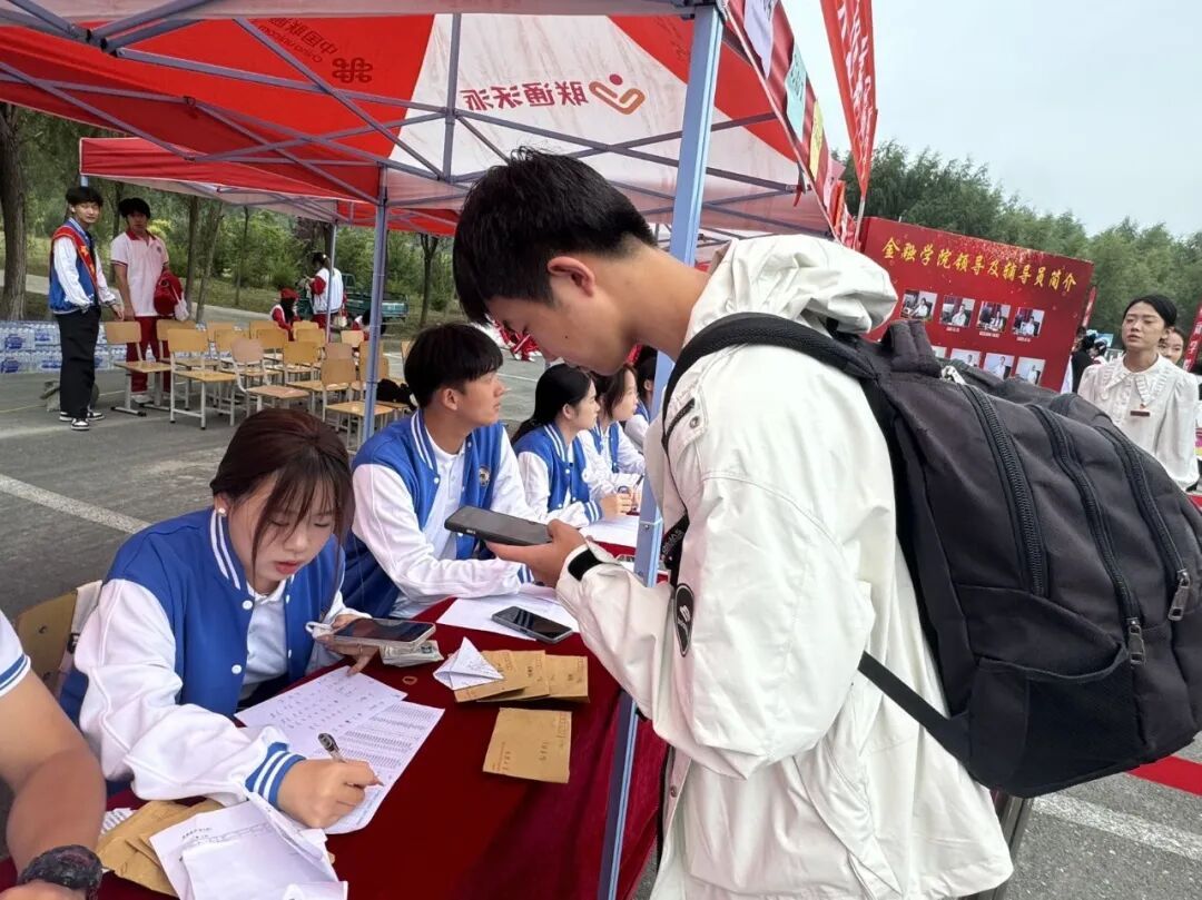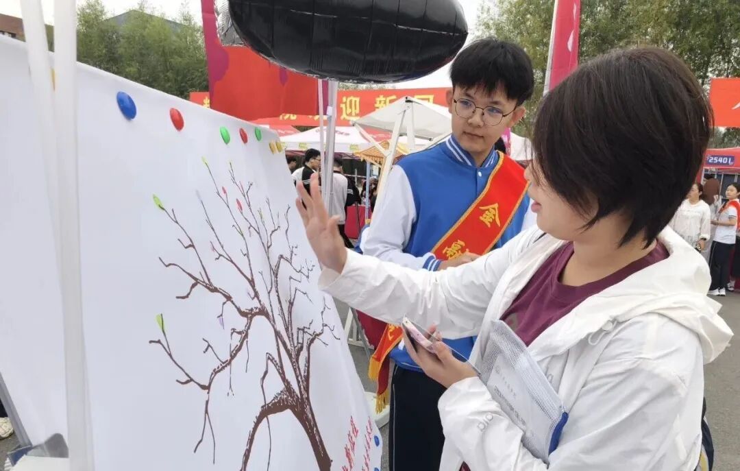“来,看这里!笑一个!”2025级新生在学院“打气站”前留下珍贵瞬间,在学院“礼品站”前领取礼品。