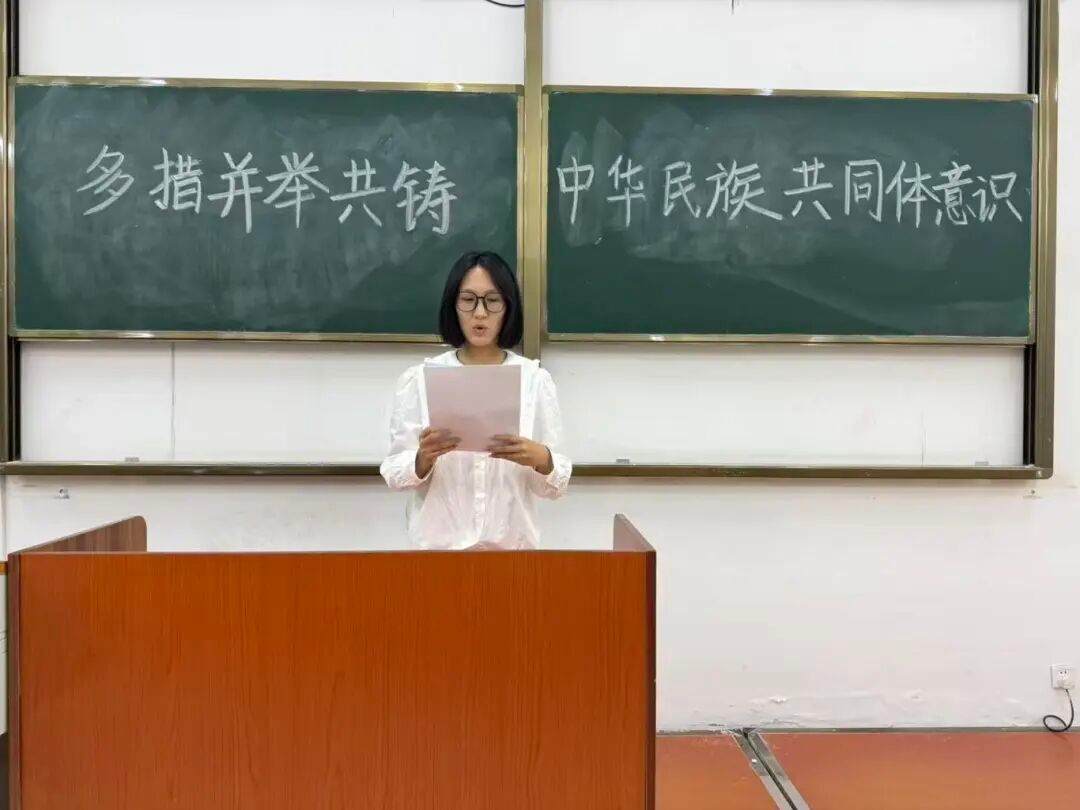 本次活动紧扣铸牢中华民族共同体意识主题核心,围绕“铸牢中华民族共同体意识需夯实政治、文化、经济、社会、法治五大基础”的核心论述展开。学生代表何悦华结合自身感受,向大家阐释了文件要点:从“坚持党的领导是各民族团结奋斗的根本政治保障”,到“构筑中华民族共有精神家园需推动中华优秀传统文化创造性转化、创新性发展”,用通俗生动的语言将文件理论与青年学习生活相联结。