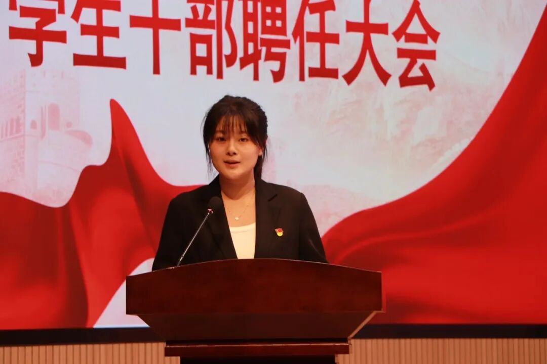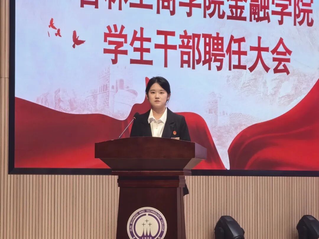 第二十届学生干部代表张馨媛上台发言,她表示,全体受聘学生干部将以饱满的工作热情投身学院各项工作,密切关注同学需求,与全体同学携手共进,以实际行动助力金融学院各项事业再上新台阶。新老学生干部的交替,不仅是岗位的更迭与经验的接续,更是青春力量的交接与服务初心的传承。