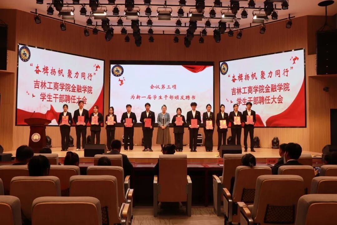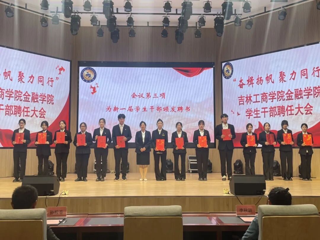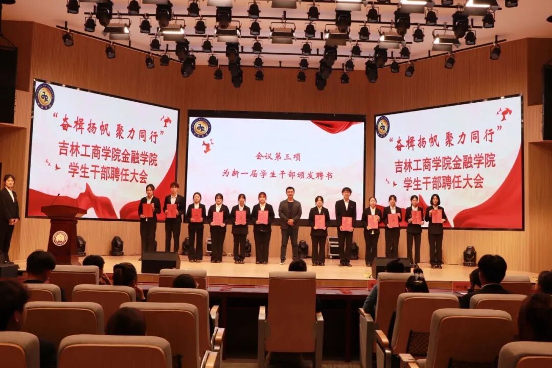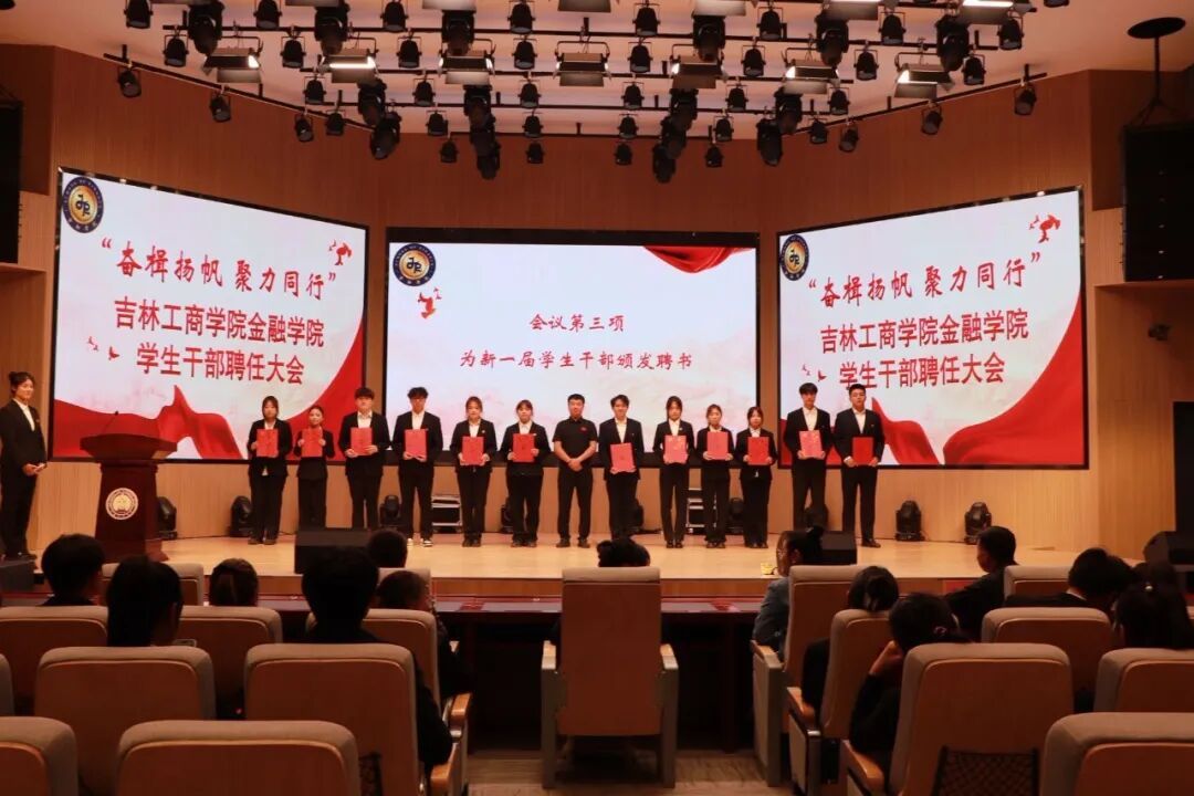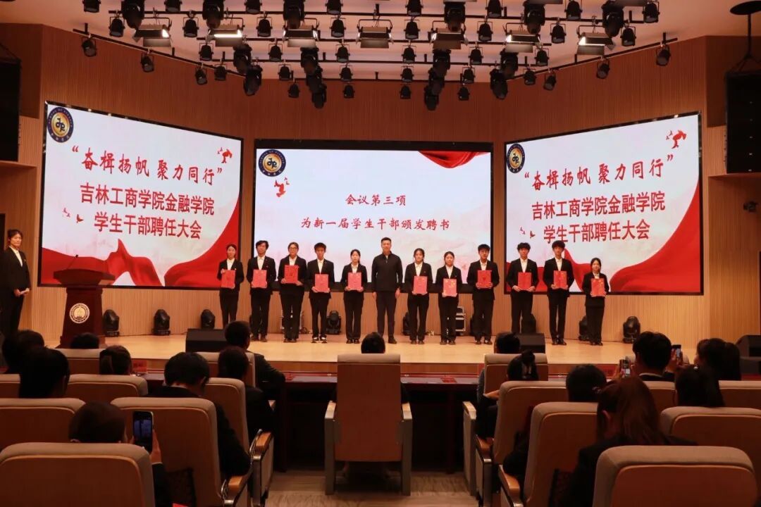 为打造高素质、高水平大学生干部队伍,夯实团学工作组织根基,9月29日,金融学院在博学楼117剧场举办了“奋楫扬帆,聚力同行”学生干部聘任大会。学院党委副书记李美婧,学团办主任孙殿春、副主任李秋颖,辅导员谢云超、程鹏程参加本次会议,学院分团委、学生会、大学生事务服务中心、各社团全体学生干部及2025级学生代表参会。