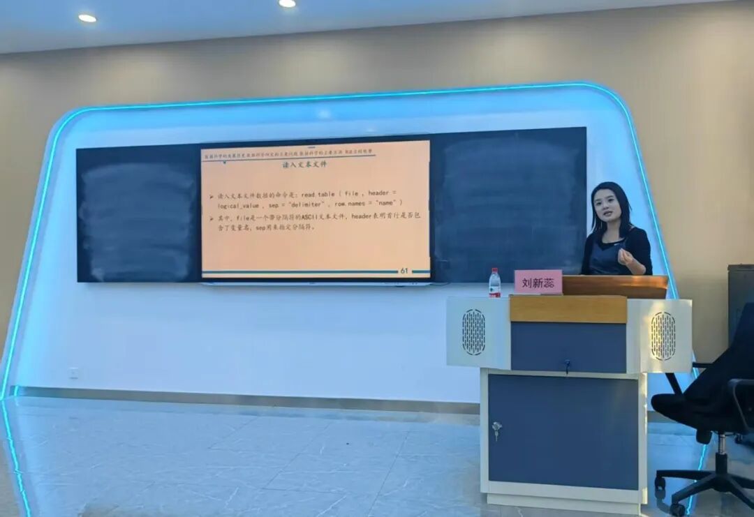 在随后进行的专题培训中,刘新蕊以“基于R语言的数据分析与统计软件基础介绍”为题,为在场教师带来了一场内容丰富、结构清晰的实操讲座。她首先系统介绍了数据科学的发展历史、研究的主要问题、主要方法、R语言的优势及其在金融学研究中的典型应用场景,使老师们对其功能有了整体认识。随后,刘新蕊循序渐进地讲解了R语言的基础语法、数据结构、常用函数包的安装与调用,并重点演示了数据导入与清洗、描述性统计、基本图形绘制以及基础统计建模等关键操作。刘新蕊的讲解深入浅出,逻辑严密,既有方法论的高度,又有实操的细节,为在场教师打开了运用R语言进行金融数据分析的大门。