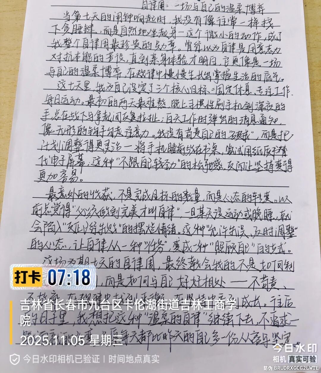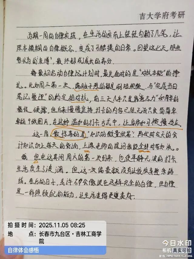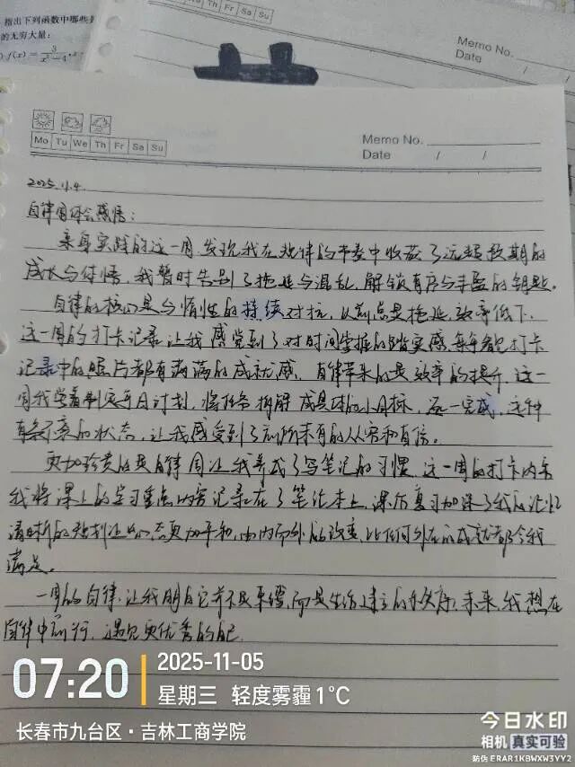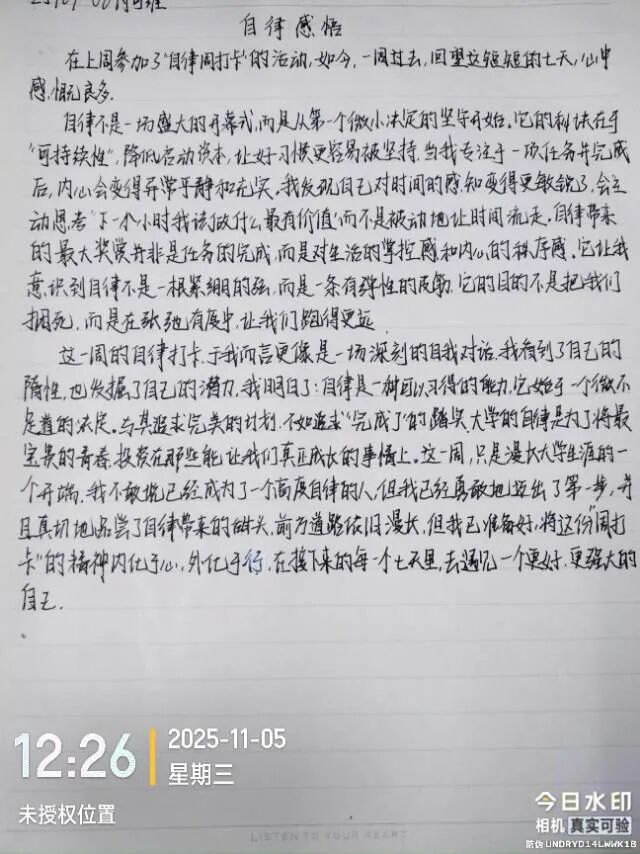 虽然打卡周已结束,但自律的火种已然播撒。期待同学们将这一周培养的好习惯延续到未来的学习生活中,让自律成为青春最亮丽的底色。愿每位同学都能在坚持中遇见更好的自己,用日复一日的积累书写无悔青春,为成长为全面发展的复合型人才持续蓄力!
