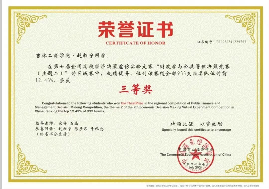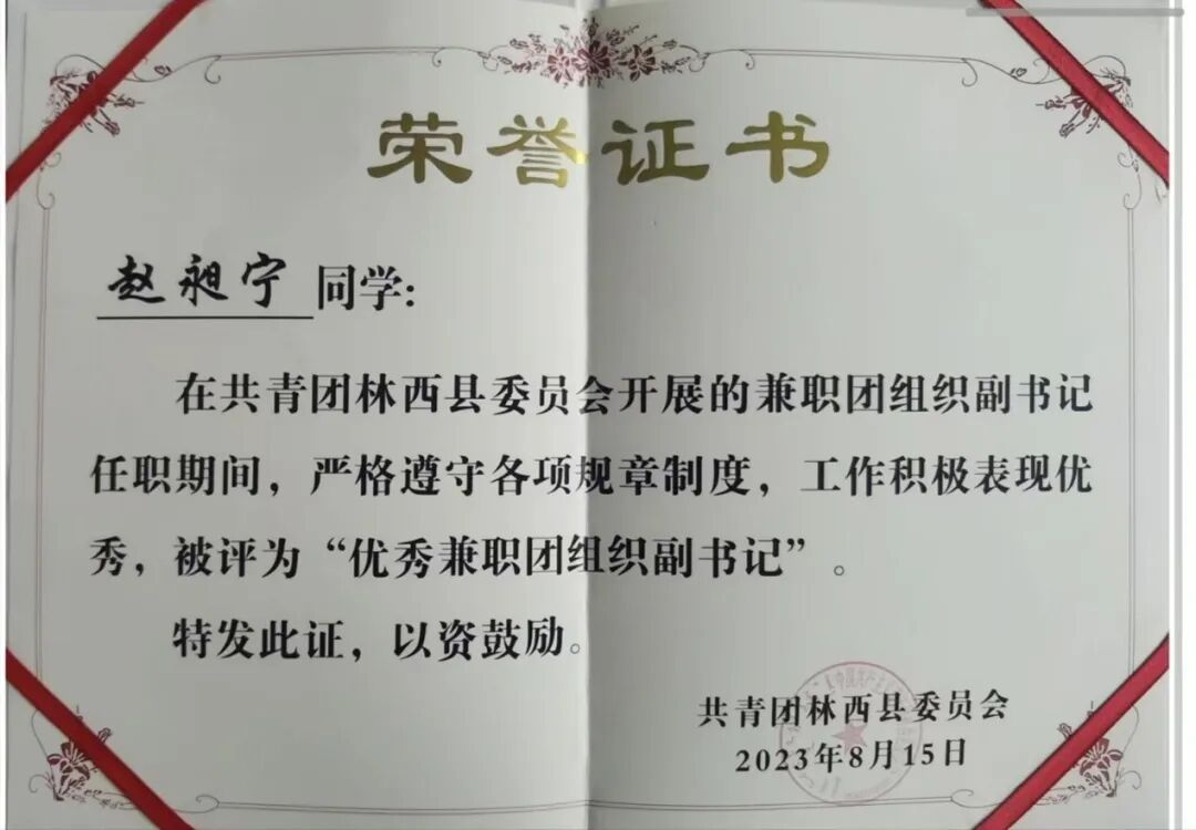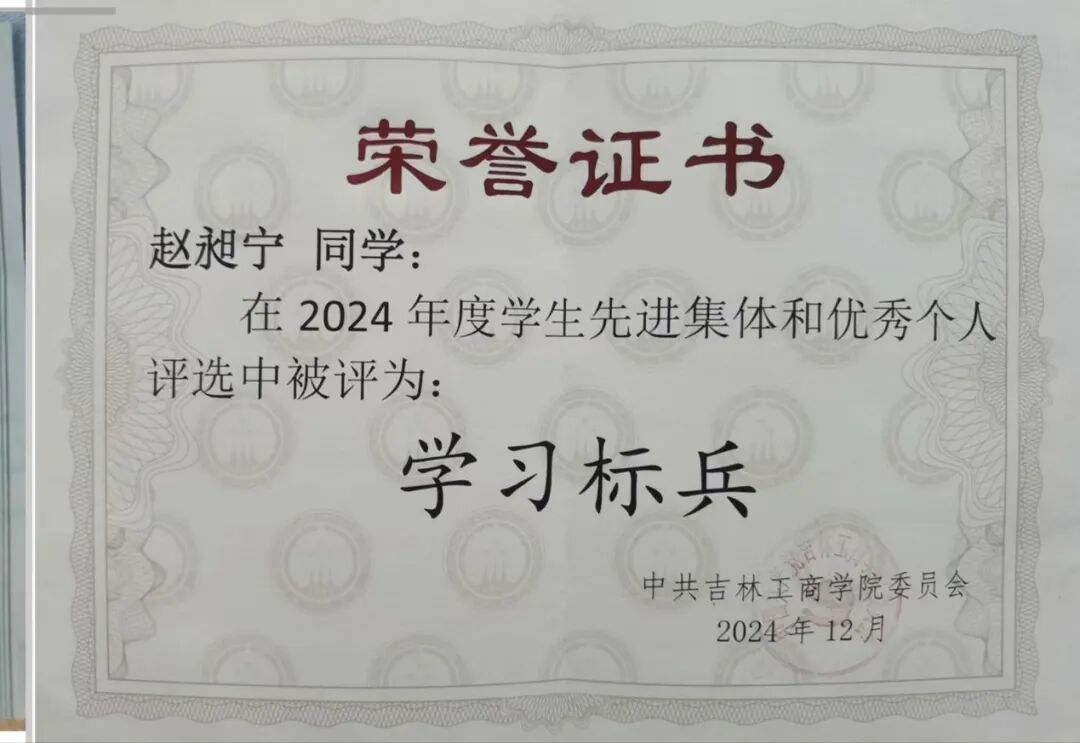 赵昶宁同学以学识为舟,以奋斗为桨,在专业领域向下深耕、向上生长,不仅构筑了扎实深厚的知识体系,更注重理论与实践紧密结合,跨界探索,在融会贯通中拓宽认知便捷,展现新时代青年的开拓创新精神。为我们树立了鲜明的标杆。这份熠熠生辉的荣誉,不仅是个人的高光时刻,更是勤勉与执着的生动注脚。见贤思齐,当如是也。愿同学们以其为榜样,汲取力量,将钦佩化为行动,用汗水浇灌梦想。不负韶华,砥砺前行,在未来的岁月里,共同谱写更加璀璨的青春华章。
