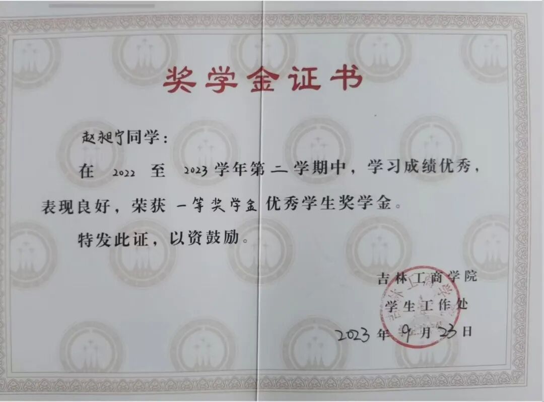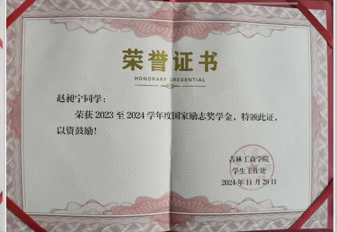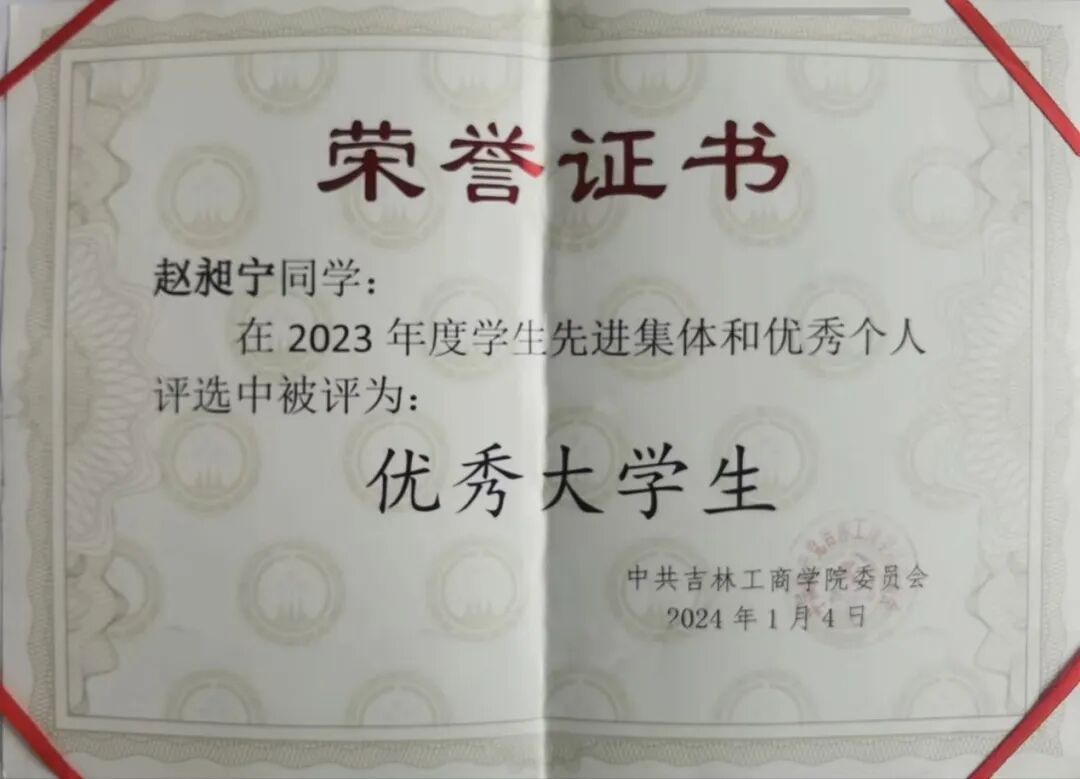 荣获5次一等奖学金、1次三等奖学金,2023年度国家励志奖学金,2025年度国家奖学金,曾获全国大学生英语四级、六级证书,全国计算机考试二级合格证书,初级会计专业技术资格证书,第七届全国高校经济决策虚拟实验大赛区域赛三等奖,曾获2023年度吉林工商学院“优秀大学生”、2024年度吉林工商学院“学习标兵”、2023年共青团林西县委员会“优秀兼职团组织副书记”等荣誉称号。
