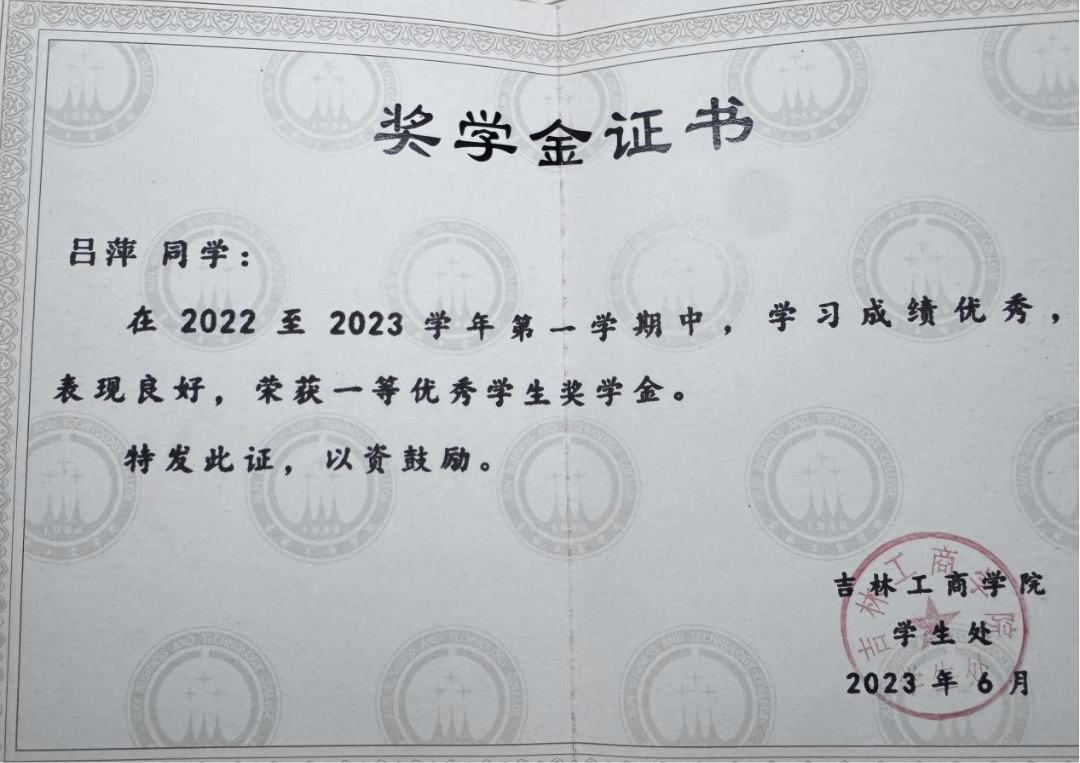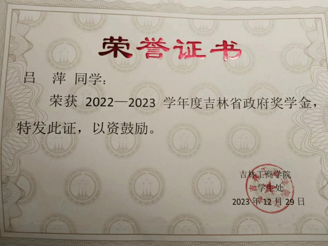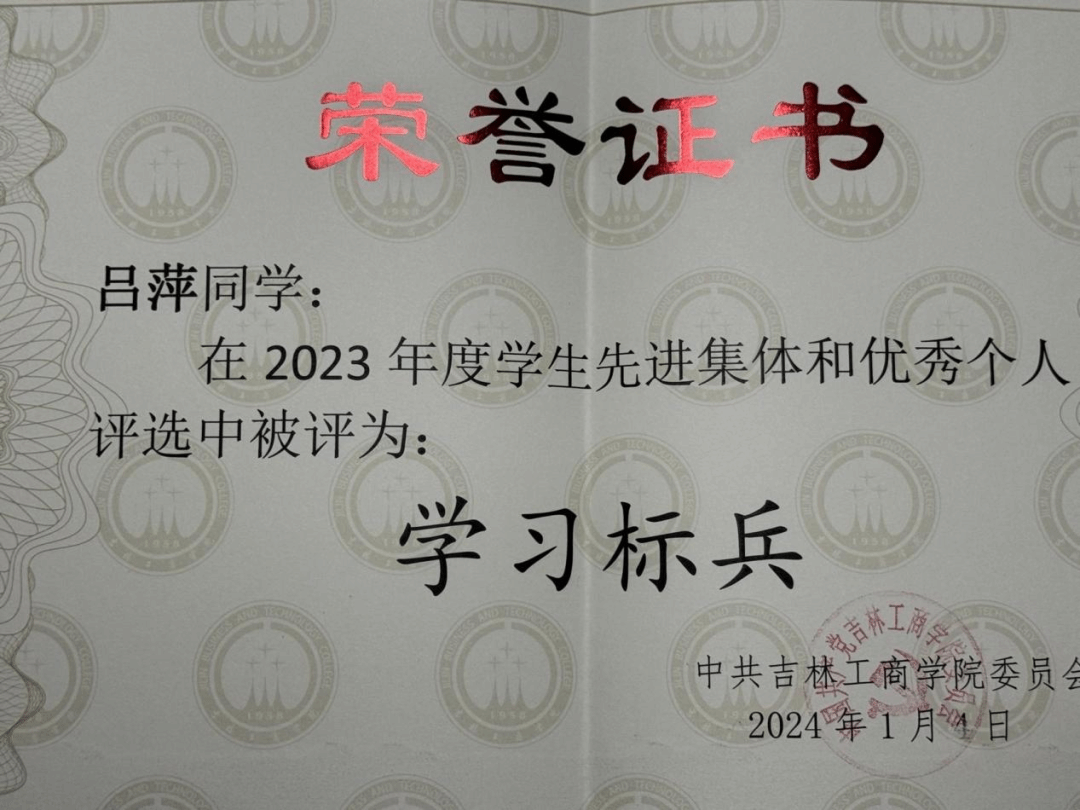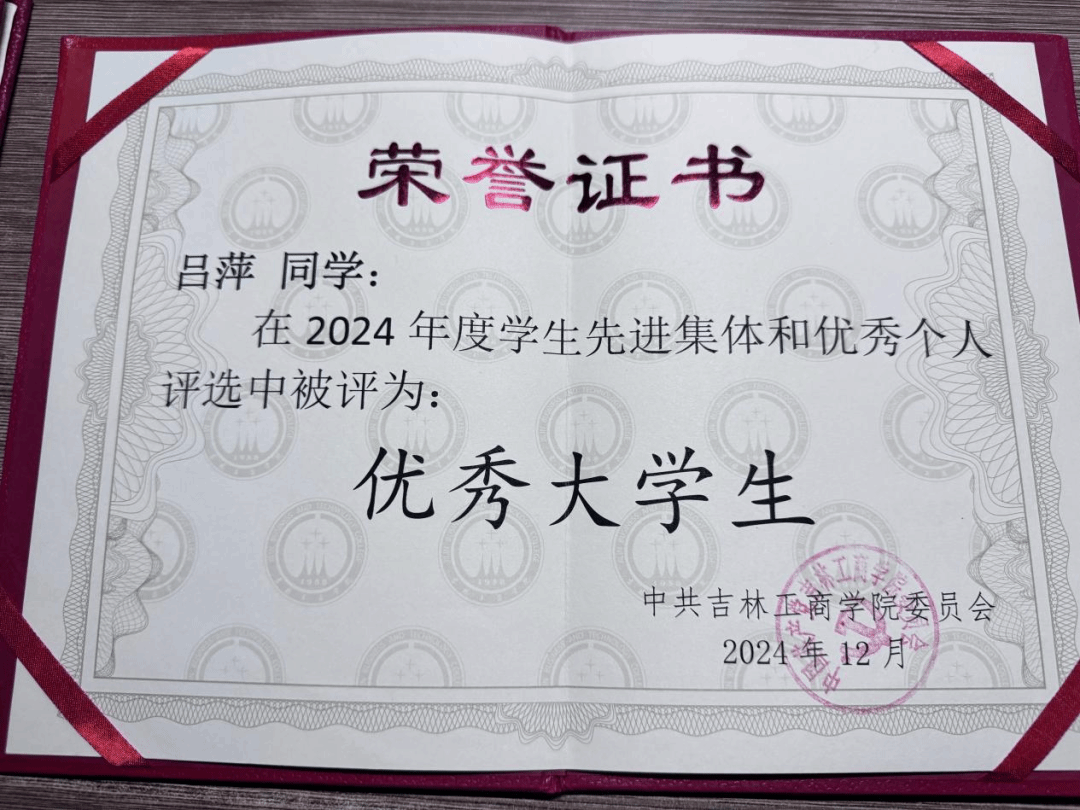 荣获六次一等奖学金,2022-2023学年度吉林省政府奖学金,曾获2023年度学习标兵,2023年县级优秀志愿者,2024年度优秀大学生,2025年优秀团员荣誉称号,曾获2023年创新创业会展竞赛二等奖。
