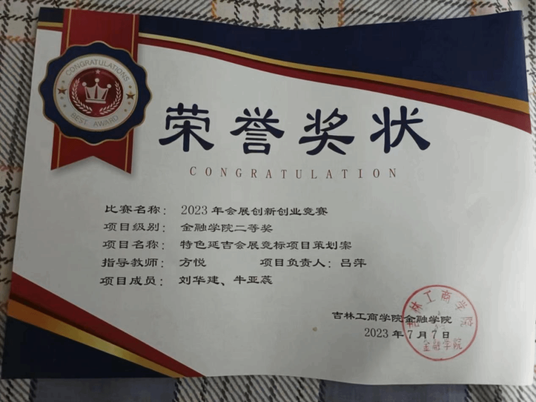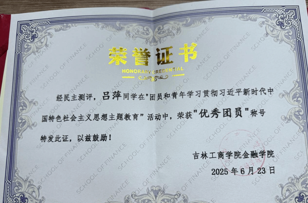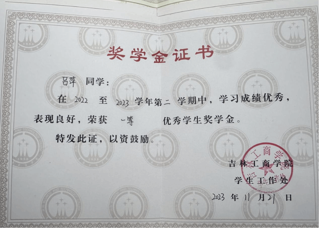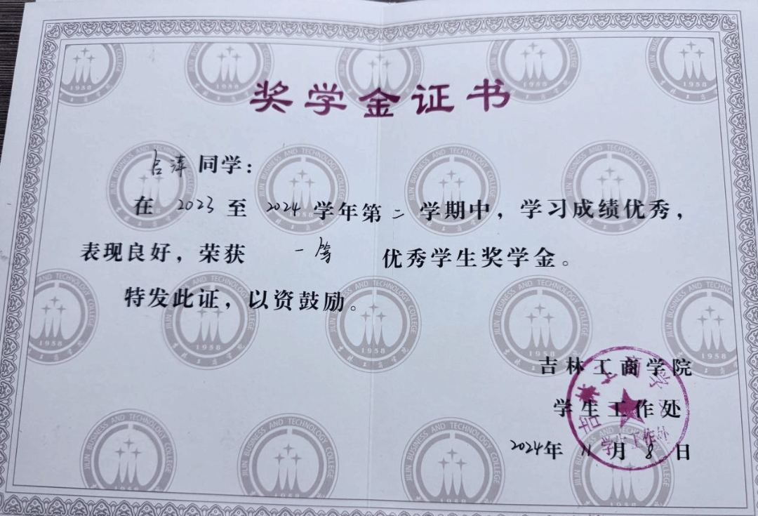 荣获六次一等奖学金,2022-2023学年度吉林省政府奖学金,曾获2023年度学习标兵,2023年县级优秀志愿者,2024年度优秀大学生,2025年优秀团员荣誉称号,曾获2023年创新创业会展竞赛二等奖。