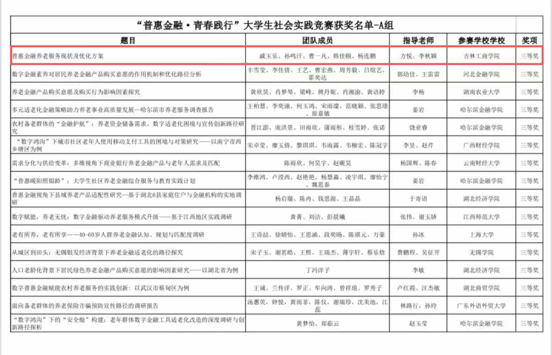 近日,中国金融教育发展基金会公布了2025年“普惠金融·青春践行”大学生社会实践活动的评审结果,吉林工商学院财政金融学院代表队荣获调研报告(A组)三等奖。
