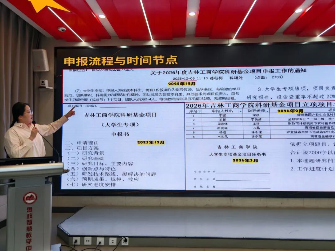 为助力学院学子申报大学生科研基金专项,提升科研申报书撰写能力与科研创新素养,搭建师生科研交流学习平台,3月12日,吉林工商学院财政金融学院举办大学生科研基金专项申报经验分享会。本次分享会邀请3名立项学生代表及2名指导教师担任嘉宾,会议由副院长王晓丹主持,全院有意向申报该专项的师生参会学习。
