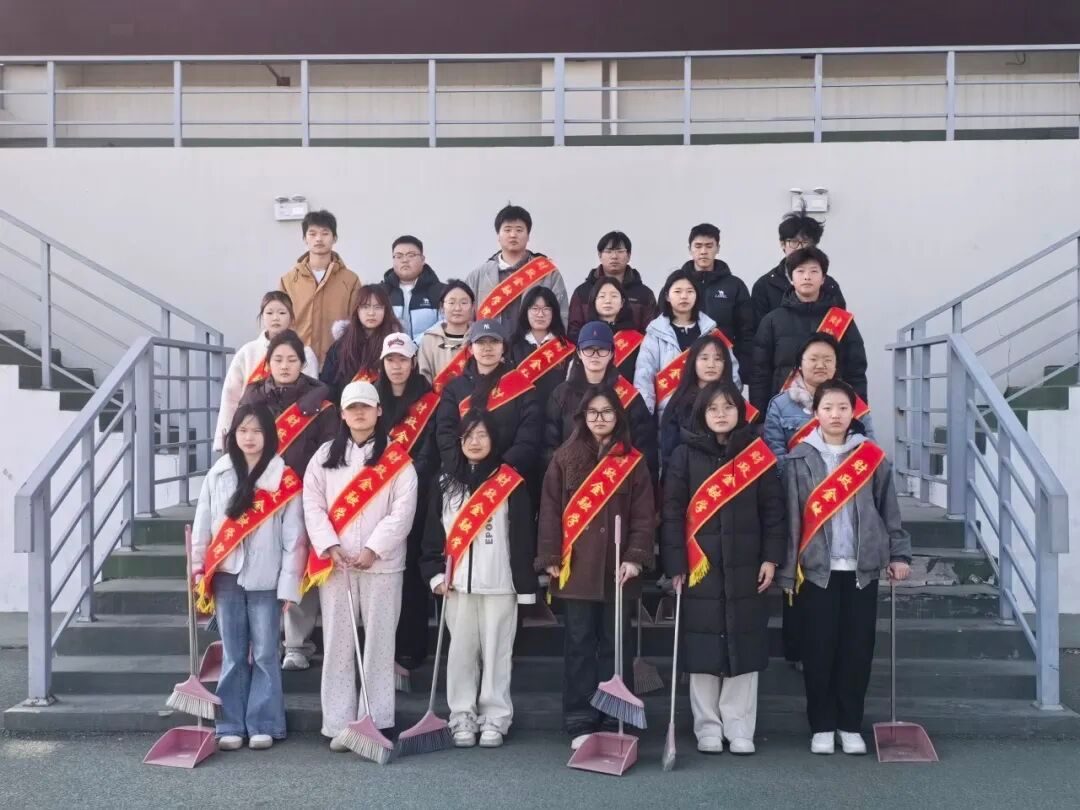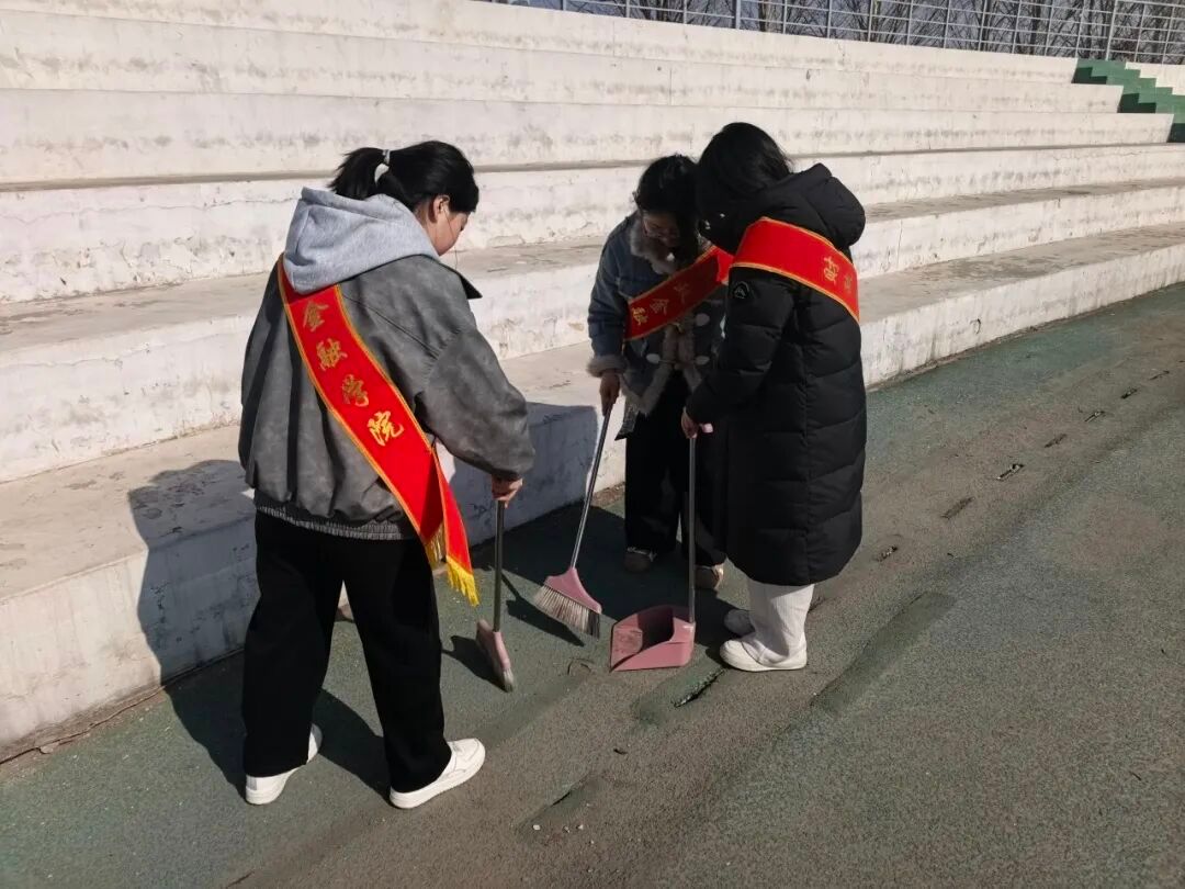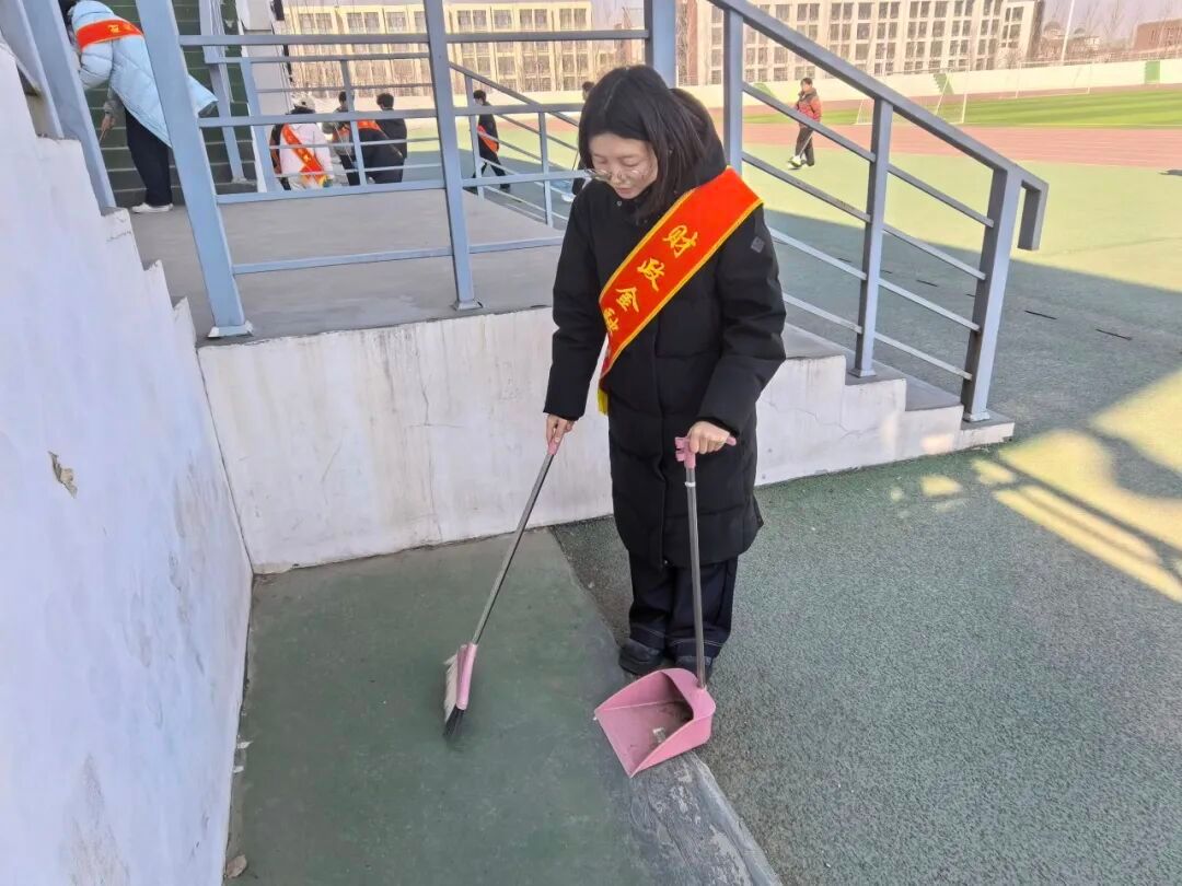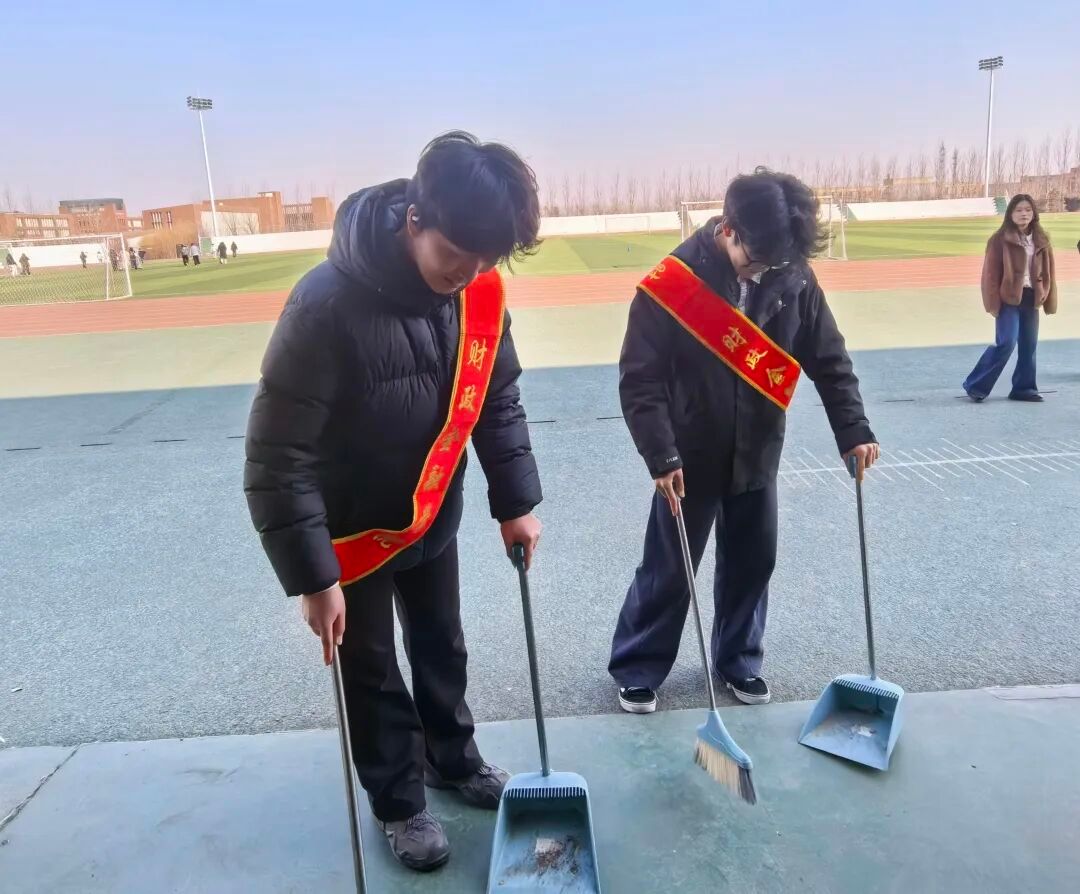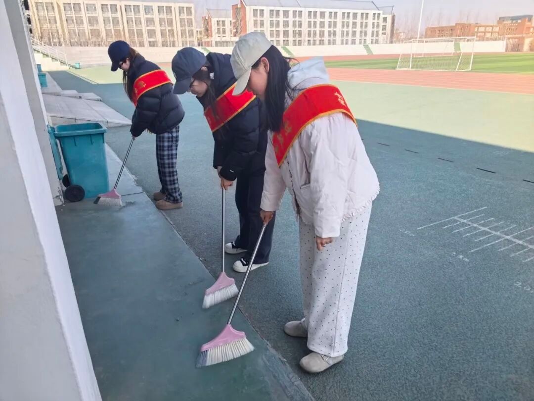 活动中,青年志愿者们身着志愿红,化身校园“美容师”,带着清洁工具奔赴校园一操场。大家分工协作、默契配合,弯腰捡拾草坪中的纸屑垃圾,清理看台上的灰尘,原本散落的垃圾被清理干净,杂乱的区域变得整洁有序,校园面貌焕然一新,处处洋溢着清新整洁的文明气息。