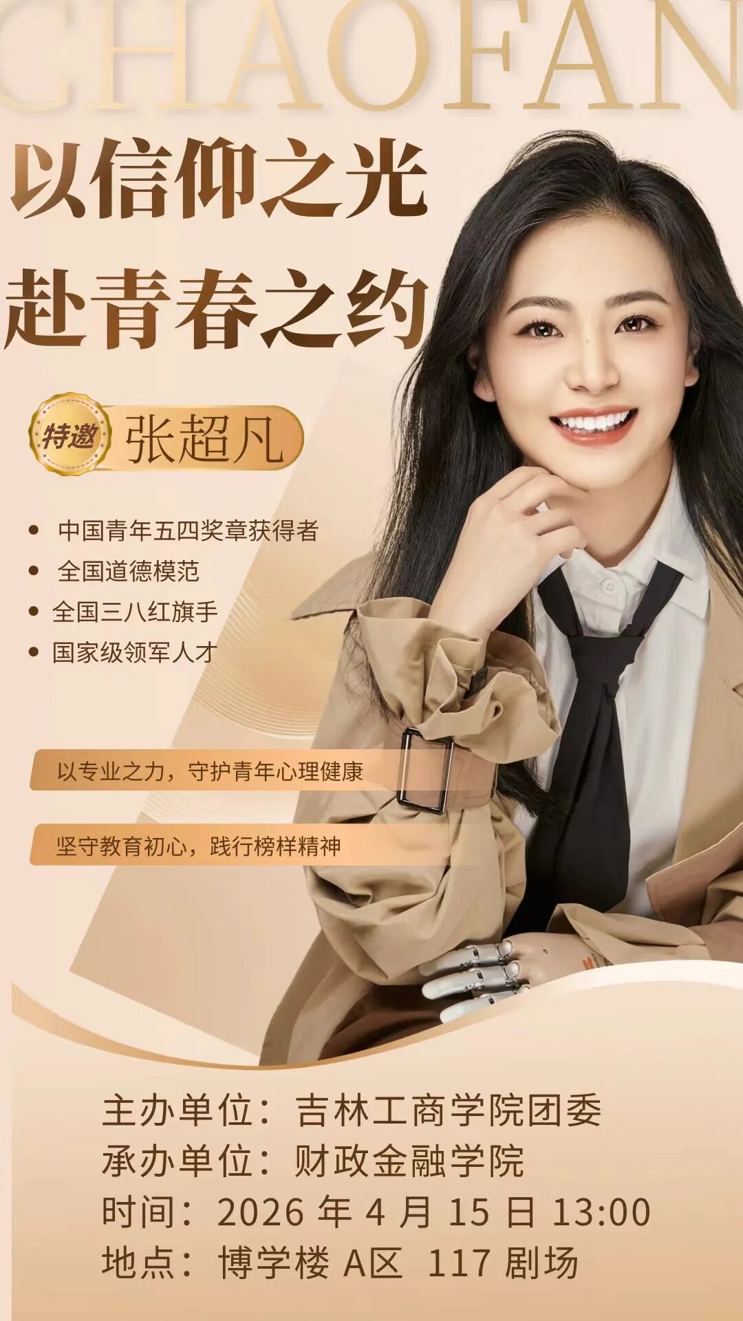 总有一种力量,能穿透岁月风霜,点燃青春热血;总有一种精神,能跨越艰难险阻,诠释生命不凡。当信仰扎根心底,当青春遇见坚守,平凡的生命也能绽放出震撼人心的光芒。此刻,我们满怀期待,向每一位心怀热爱、追逐梦想的青年发出邀请:博思讲坛特邀张超凡老师,带来“以信仰之光,赴青春之约”主题事迹分享会,让我们一同聆听独臂天使的非凡人生,汲取穿越困境、向阳而生的青春力量!
