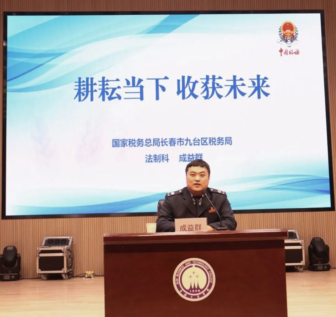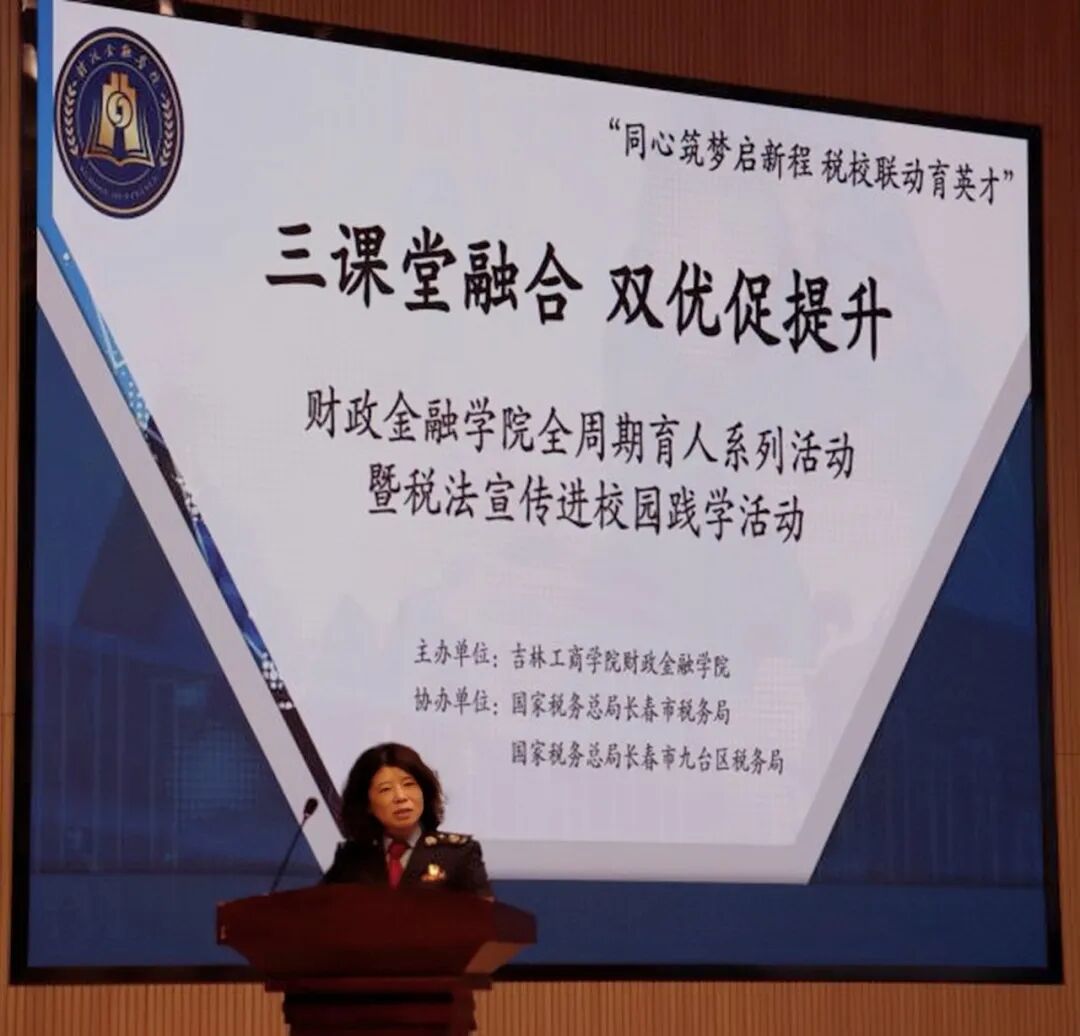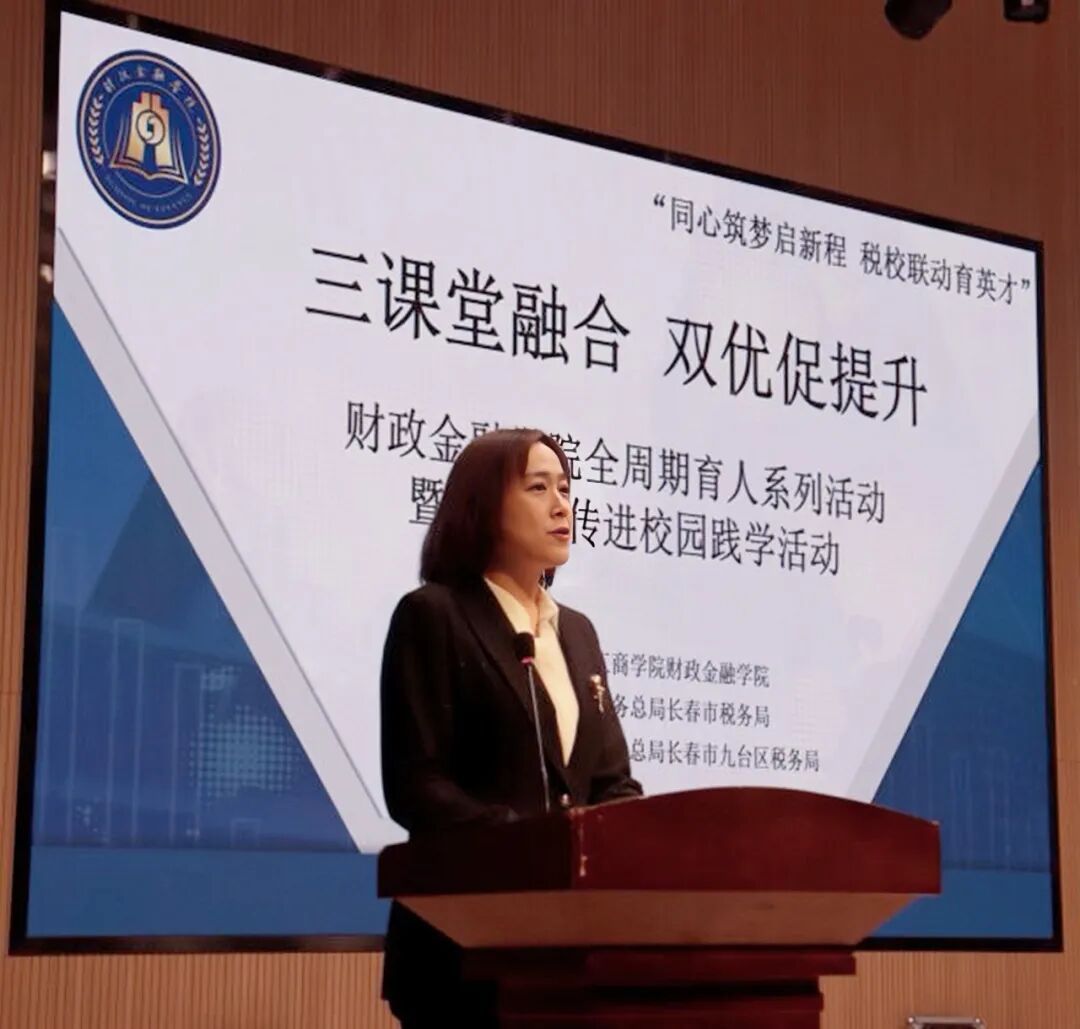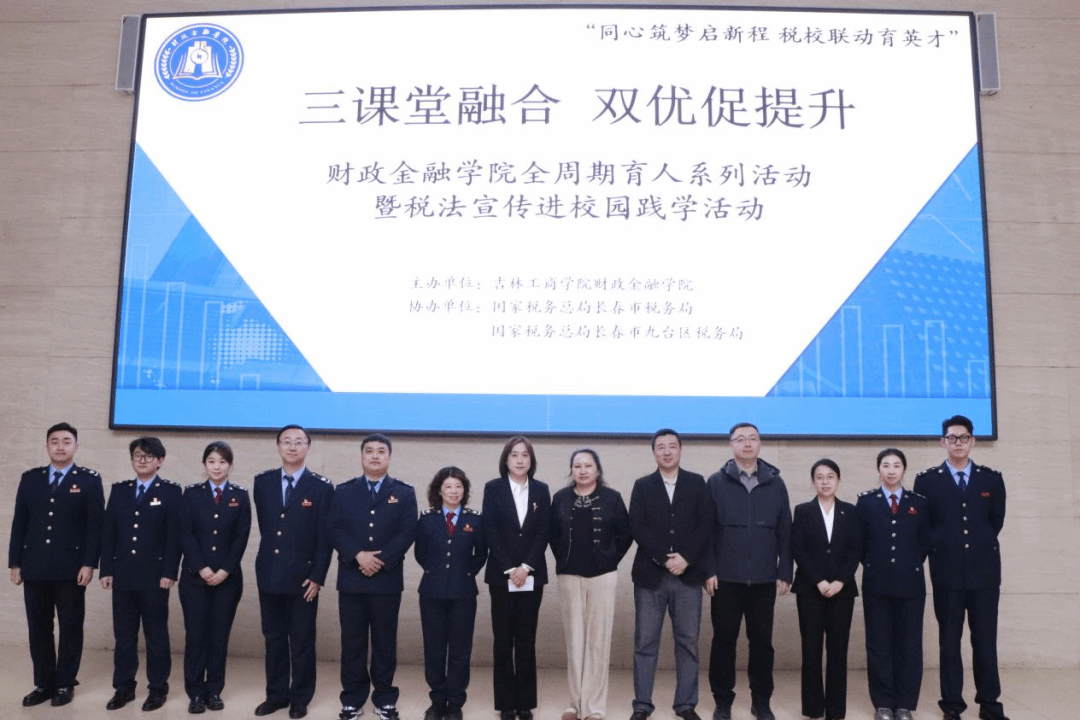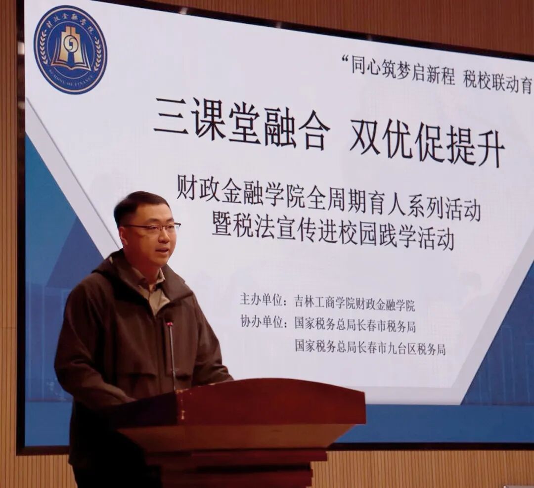 为扎实推进教育部“双优工程”落地实践,深化学校“五个一行动”部署、主动服务九台区高质量发展,财政金融学院联合长春市税务局与长春市九台区税务局,共同举办“三课堂融合 双优促提升”全周期育人系列活动暨税法宣传进校园践学活动。本次活动以“同心筑梦启新程 税校联动育英才”为主题,是学院深化产教融合、推进校税协同育人的重要实践。